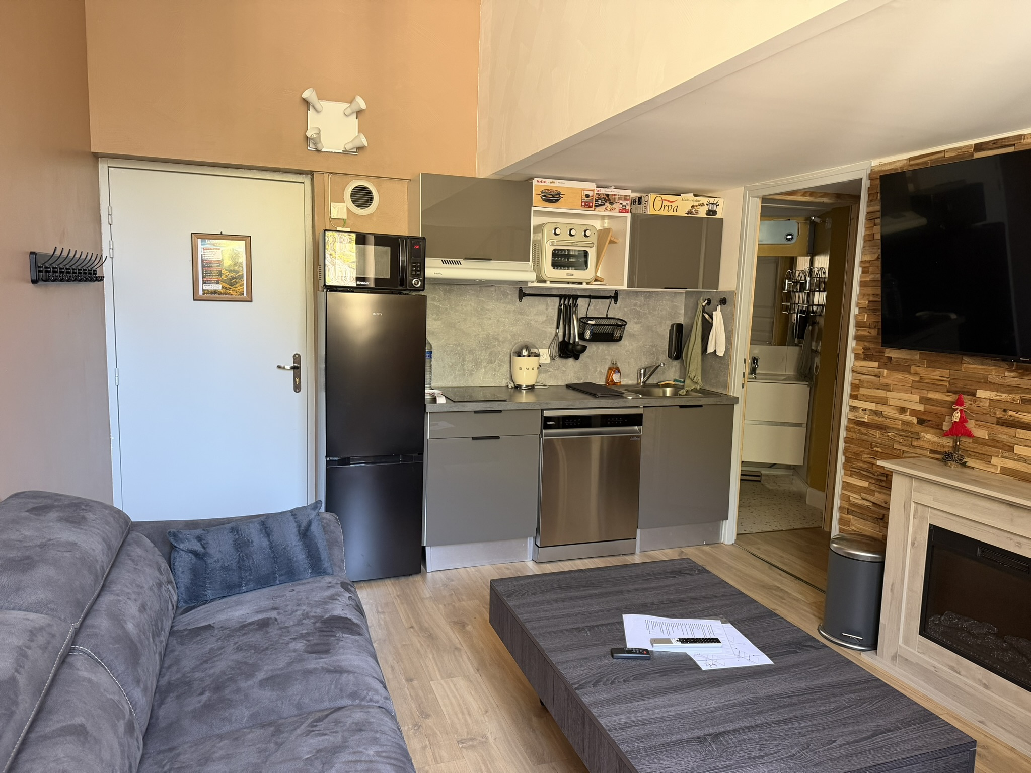 La cuisine est entièrement équipée pour préparer tous vos repas : plaques vitrocéramiques, mini-four, micro‑ondes, réfrigérateur-congélateur, lave-vaisselle, cocotte-minute, cafetière à capsules, bouilloire, grille‑pain, ustensiles et vaisselle complets, ainsi qu’un appareil à raclette et un appareil à fondue pour les soirées montagnardes. Vous trouverez aussi lave‑linge, sèche‑linge, sèche‑cheveux, aspirateur, fer et planche à repasser.