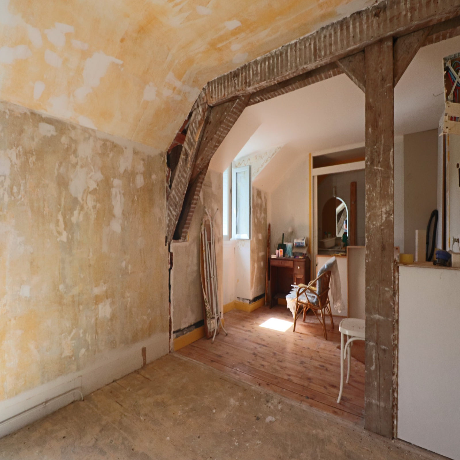 Antérieurement, il s'agissait de 2 pièces mansardées séparées par une cloison. Le propriétaire actuel a abattu la cloison pour agrandir le volume. Il a également changé les huisseries (double vitrage pvc).