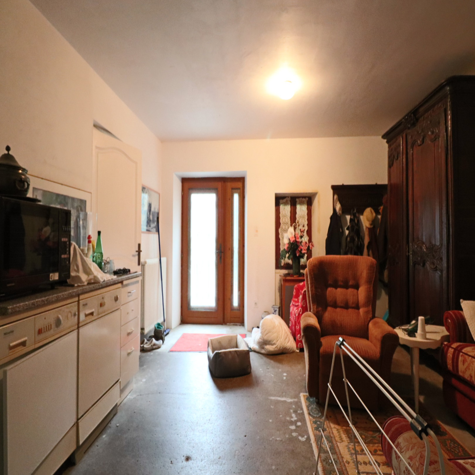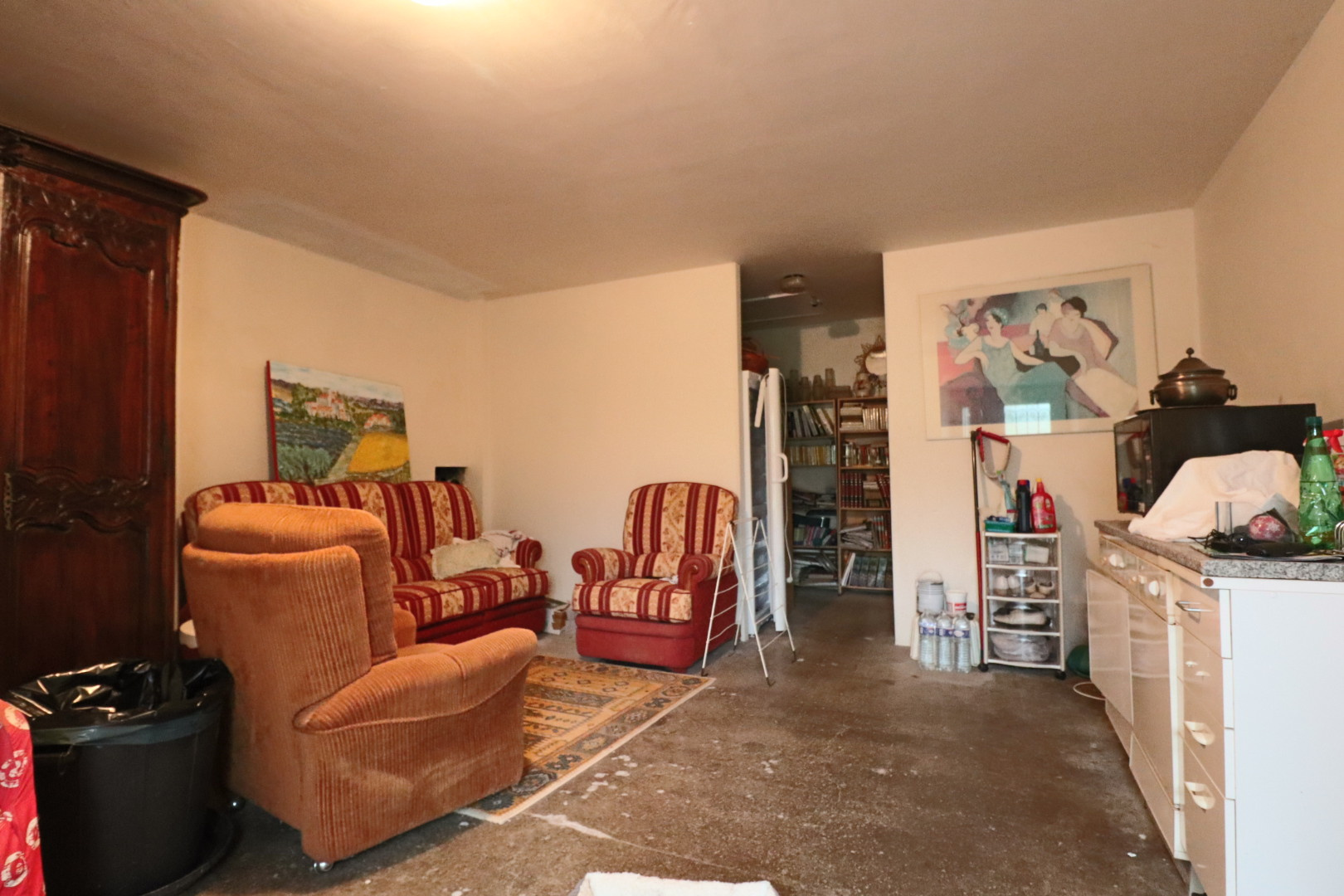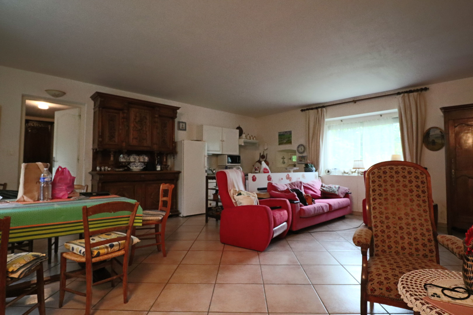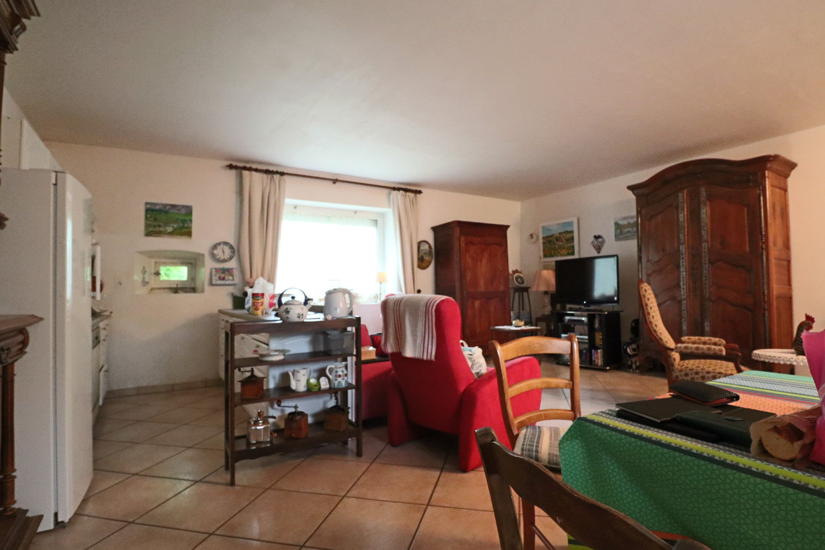 - au rez-de-chaussée : une entrée, une chaufferie, un wc, une cuisine ouverte sur une salle à manger, un salo, une chambre et une salle de bain